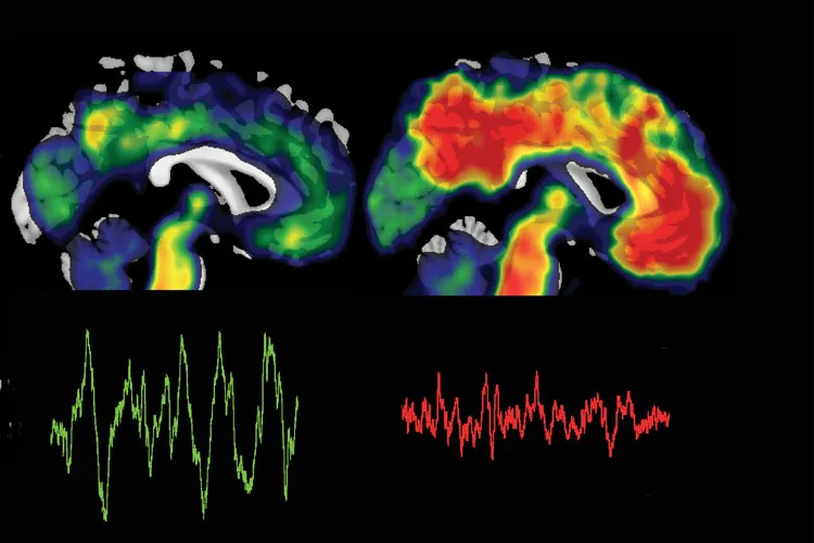 Tunge aflejringer af det giftige protein beta-amyloid, der kan ses med rødt i hjernen til højre, er forbundet med dårlig søvn og kan være nøglen til Alzheimers sygdom. En hjerne, der nyder godt af hjernebølger fra en dyb, helbredende søvn og et fravær af beta-amyloid, kan ses til venstre. Billedet er udlånt af dr. M Walker